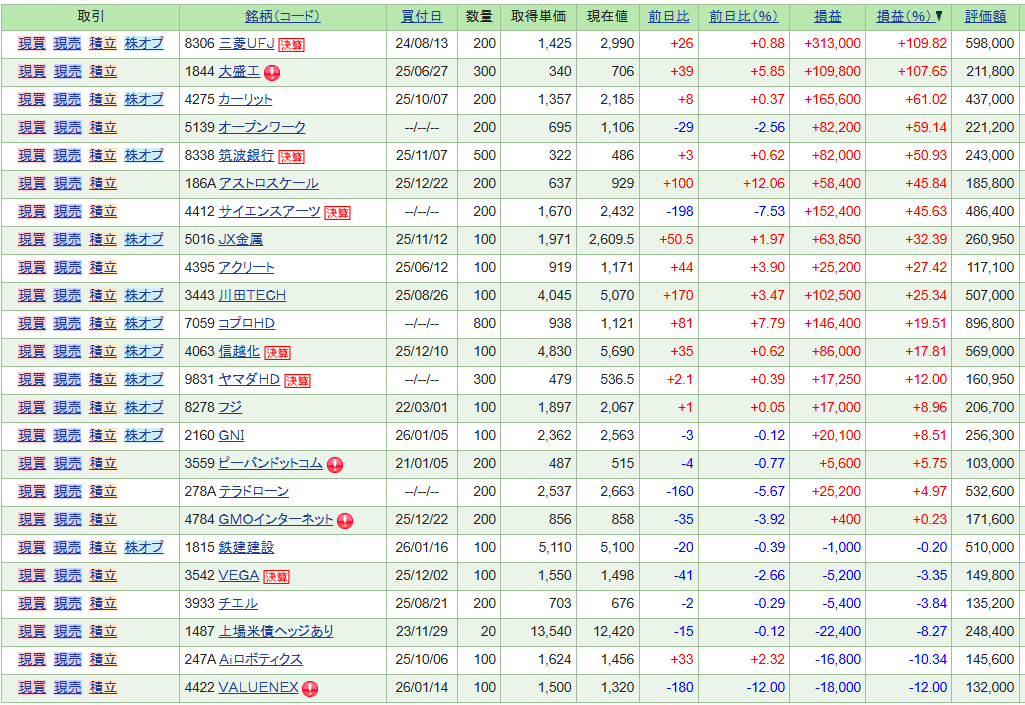 26_1_16 ポートフォリオ 未分類 X Facebook はてブ LINE コピー 2026.01.17 来週はいよいよ衆議院選挙の公示があります。自民党圧勝の予想が出てくるともうもう一伸びが期待されます。日経の半導体銘柄からもっと広い銘柄に資金が流れています。 小型株にもチャンスが来ています。